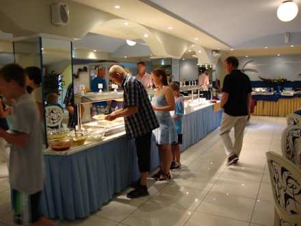 HauptspeisenbuffetHauptrestaurant: Es gibt auch noch ein Salatbuffet und ein Nachspeisenbuffet, beide gleich groß wie dieses Hauptspeisenbuffet.