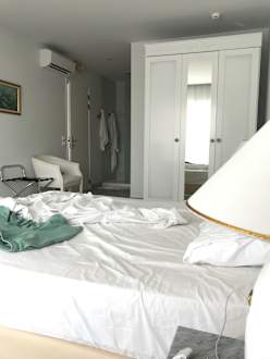 Im Schlafzimmer ist ein "offenes" Bad integriert. Vom Bett kann man Beispielsweise, wie man hier auf dem Bild sieht, auf die Dusche schauen. Die Waschbecken befinden sich hinter dem Schrank. Die Toilette ist in einem kleinen separaten Raum.