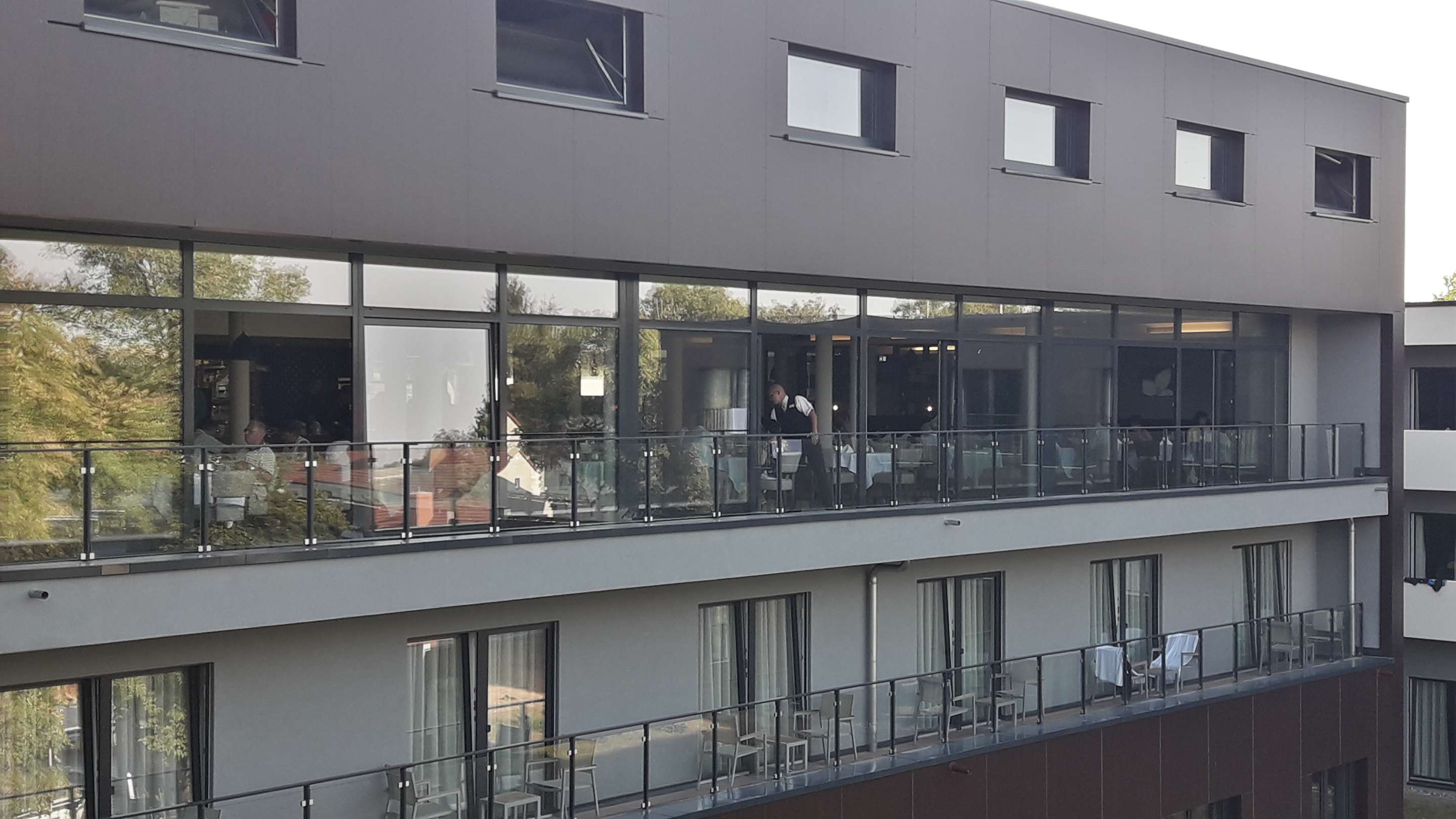 Blick auf die Fensterfront des Restaurants. Hier strahlt die Sonne von morgens bis mittags ungehindert ein, da es keine Vorhänge oder Rollos gibt. Die reinste Sauna!