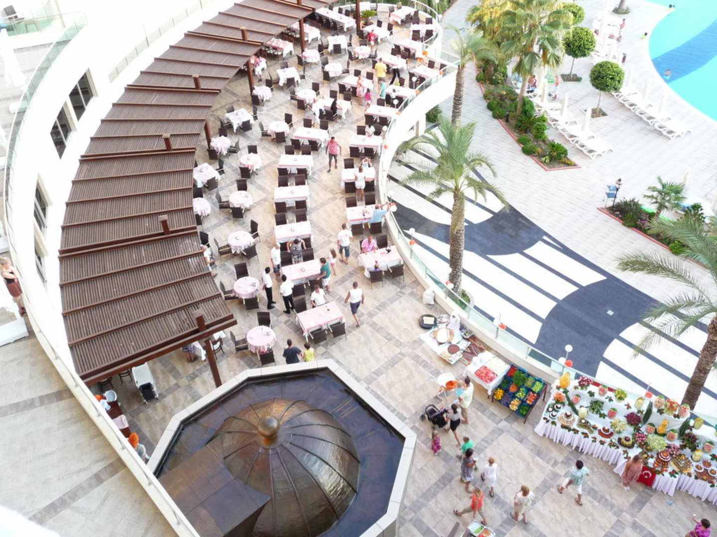 Blick vom Balkon auf Außenanlage des Restaurants