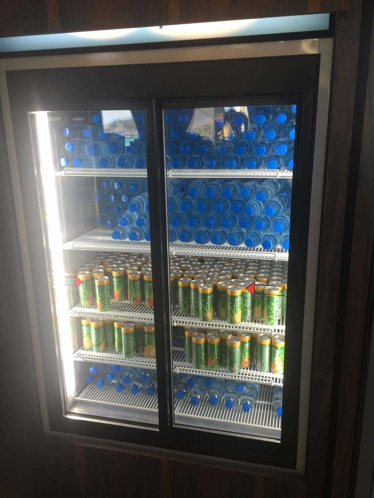 Einer der vielen Kühlschränke, die zur Selbstbedienung auf dem Gelände verteilt sind. Enthalten ist wahlweise Ayran, regionaler sowie auch Marken Eistee / Limo und Wasser.