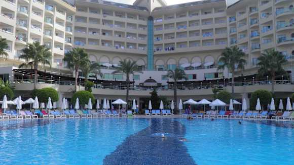 Blick vom Pool auf das Hotel