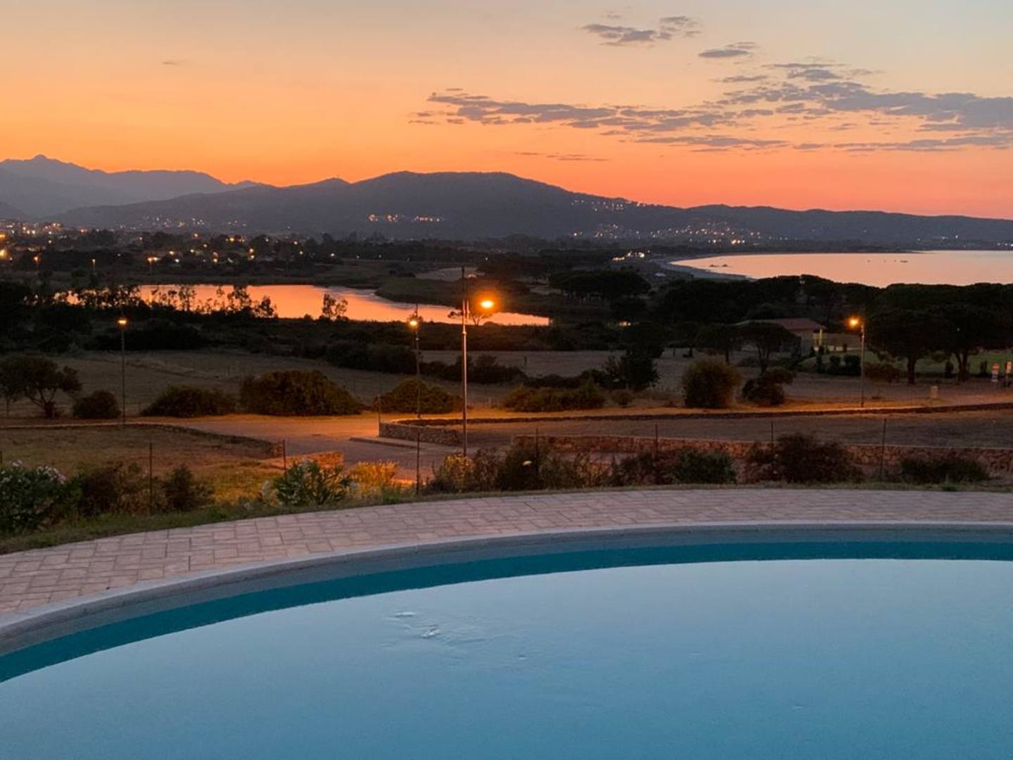 Blick von der Terrasse auf den Pool und die Bucht von Budoni