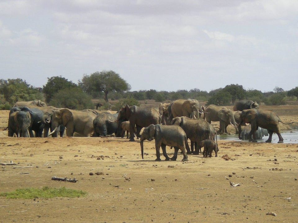 Zum Greifen nah tummeln sich unzählige Elefanten am Wasserloch.