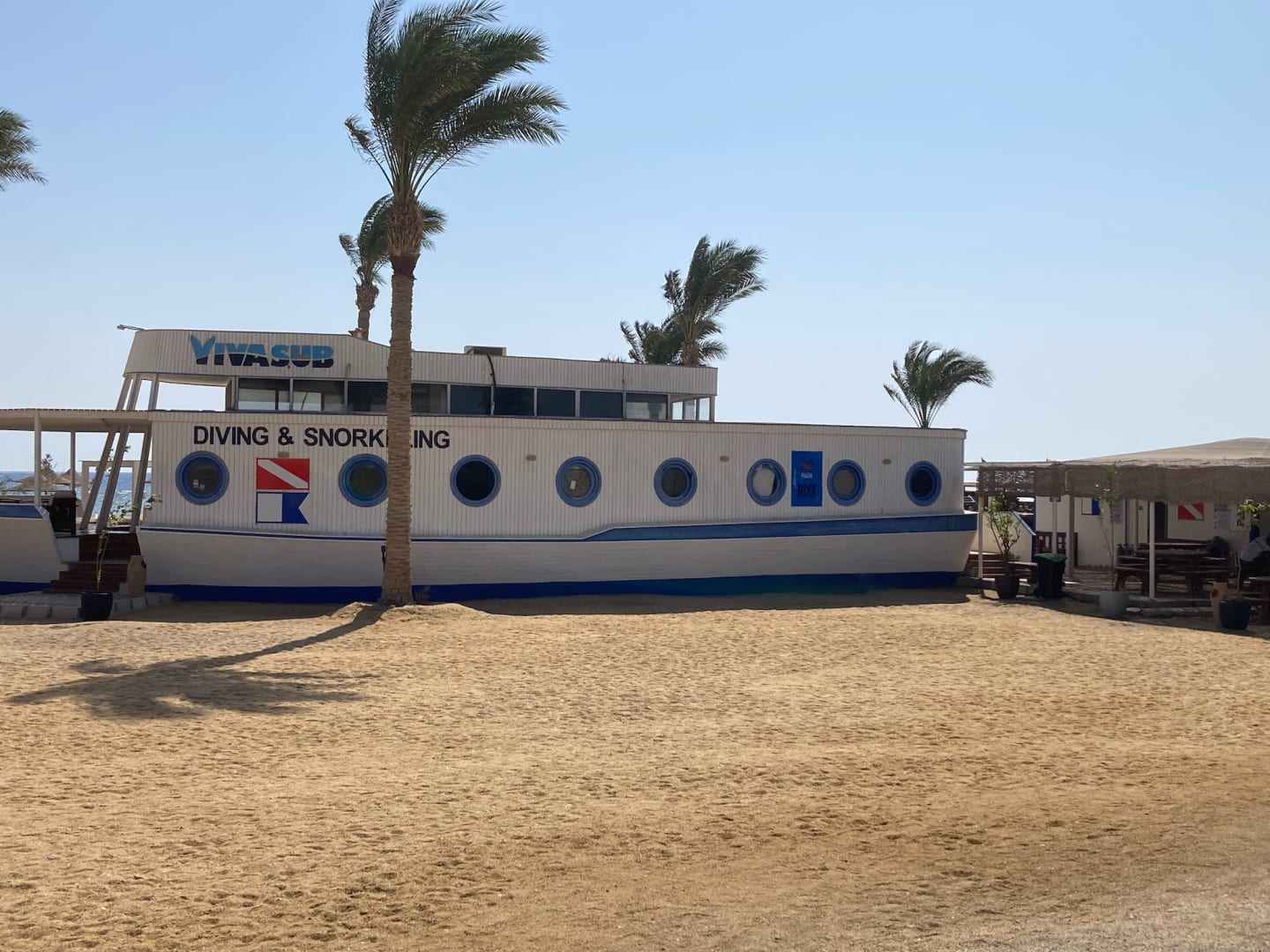 Tauchbasis VIVA SUB am Hotelstrand des Sataya Hotels. Leider besitzt die Tauchbasis keine Duschen und die Toiletten sind in Form von Dixi-Toiletten. Der Taucher MUSS zum Duschen in den Hotelbereich (am Strand, Pool, ..).