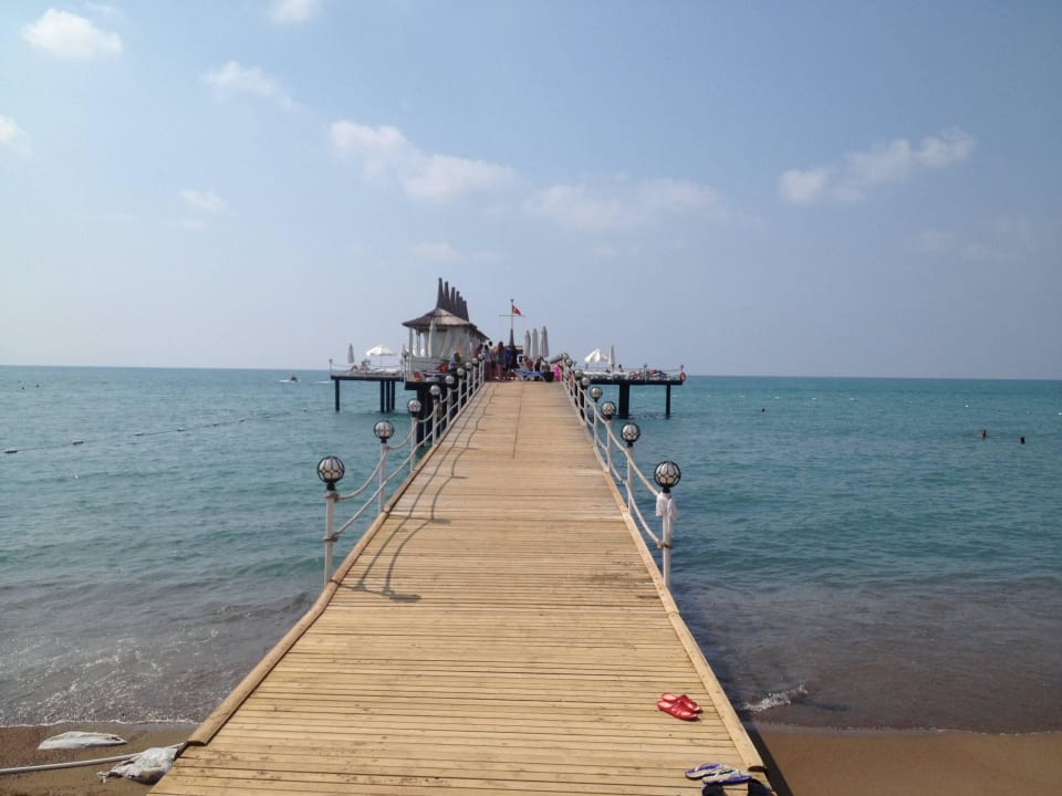 Steg ins Meer, mit Liegen und Bar