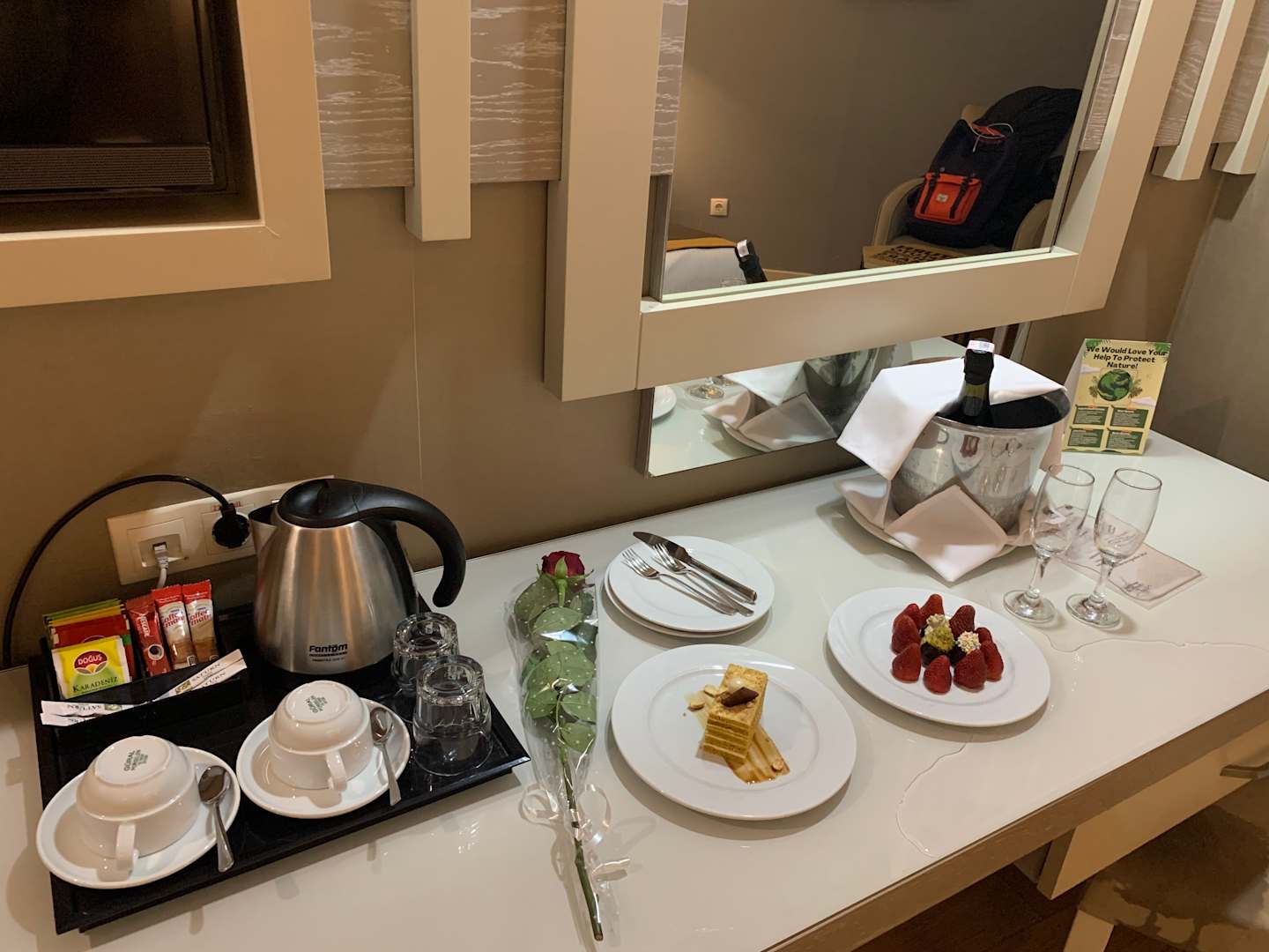 Schokoerdbeeren, Sekt und Kuchen als Empfang