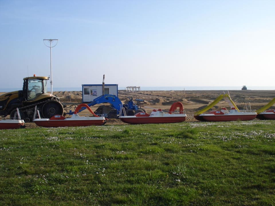 Blick auf Strand von der Promenademit Bagger wird der Sand verdichtet und die Schirme werden wie "eingegraben"