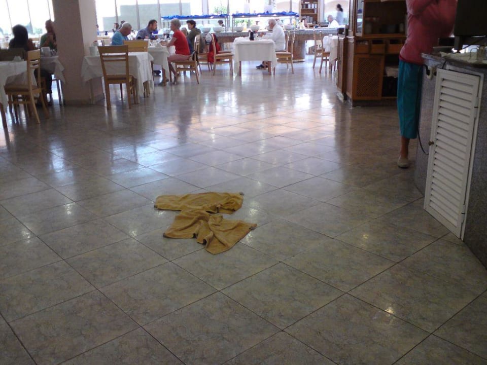 Handtücher im RestaurantHandtücher liegen auf dem Boden neben dem aufgebautem Buffet. Sie dienen dazu, das Regenwasser aufzunehmen, welches durch die Decke tropft.