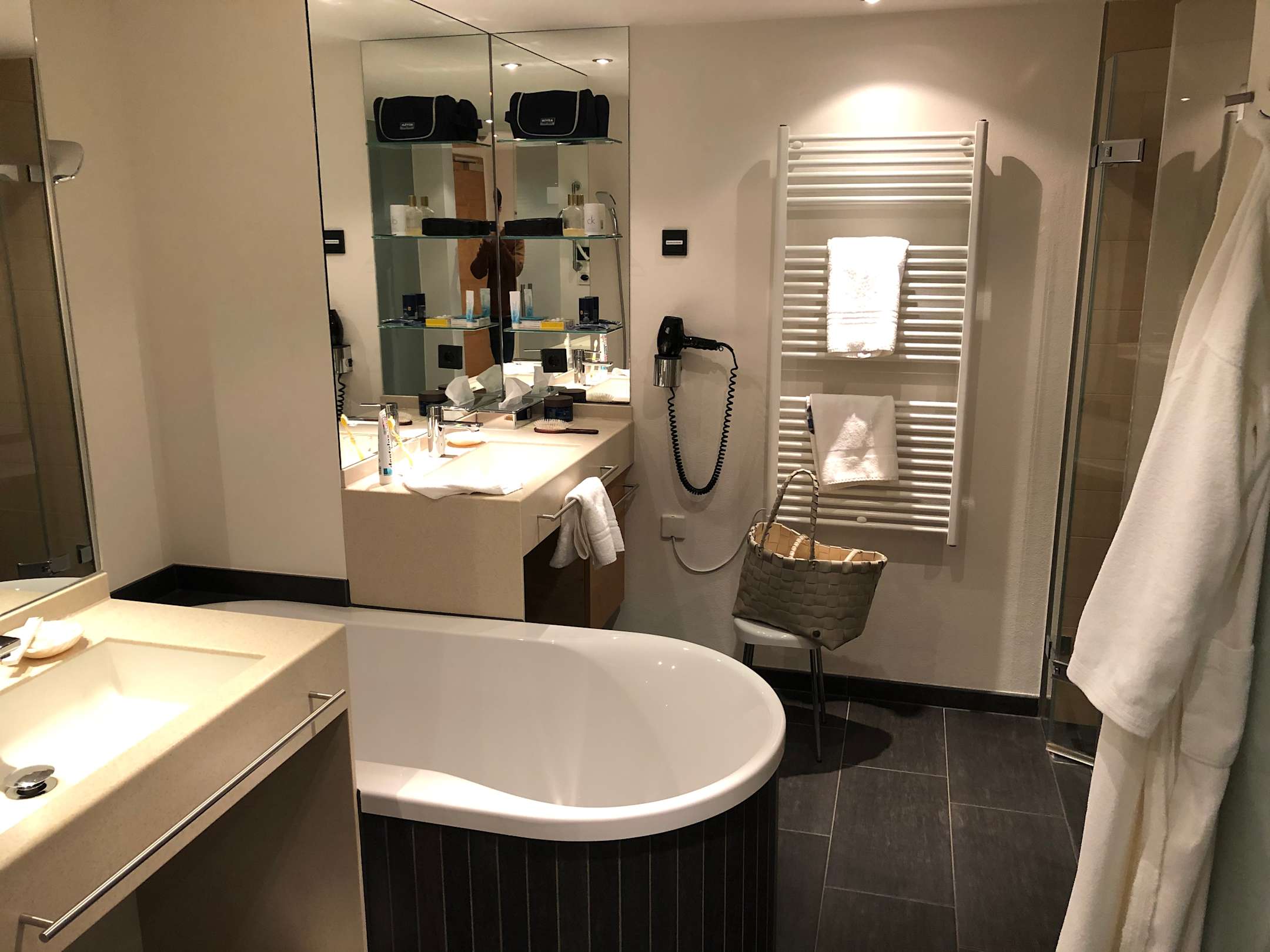 Badezimmer mit Wanne und zwei Waschbecken.