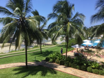 Blick vom Zimmer auf Terrasse und einen der Pools!