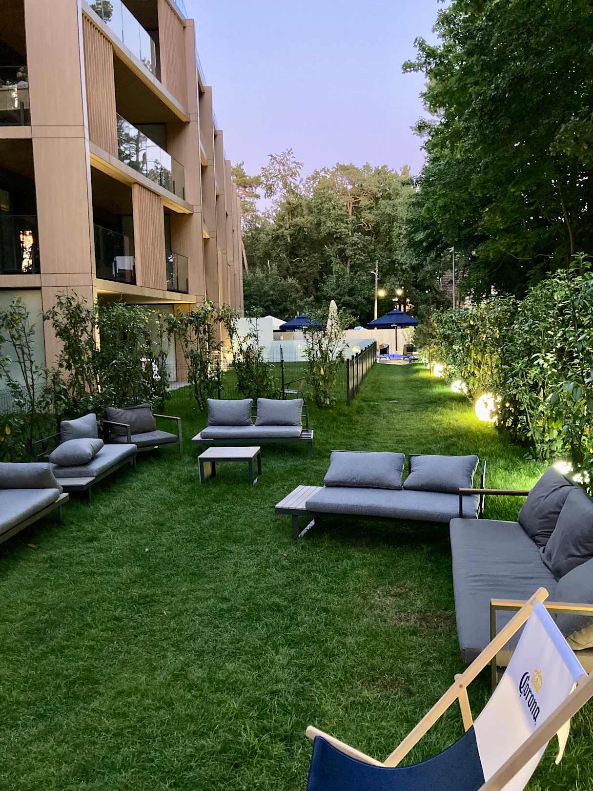 Garten mit Blick zum Außenpool mit Lounge