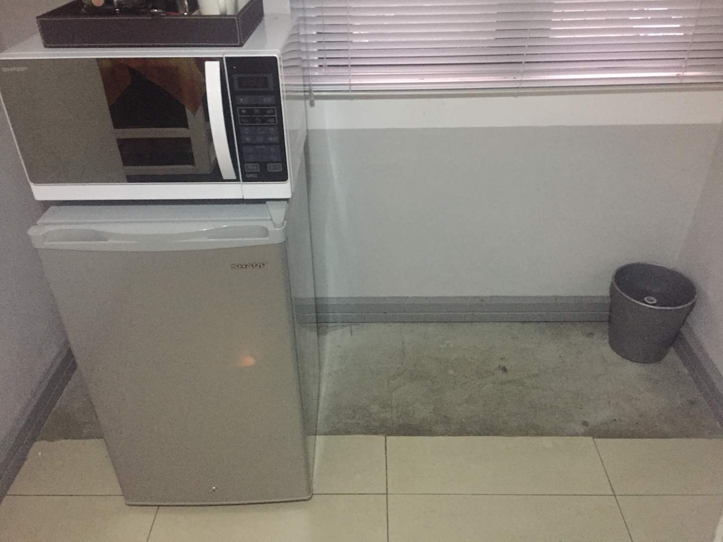 Eine Küchenzeile/Theke wäre von Vorteil und war anscheinend bereits mal vorhanden, da die Fliesen nicht bis zur Wand verlegt waren. Unter anderem wäre ev. der Kühlschrank-Mikrowellen-Wasserkocher-Turm so zu verhindern.