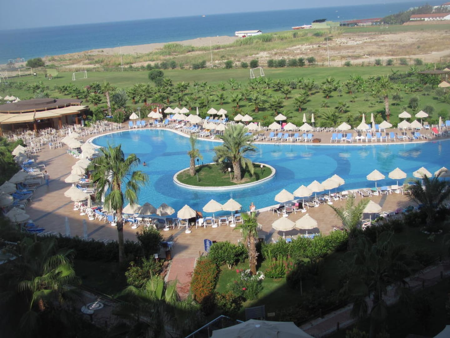 Blick vom Zimmer auf den Pool und Meer