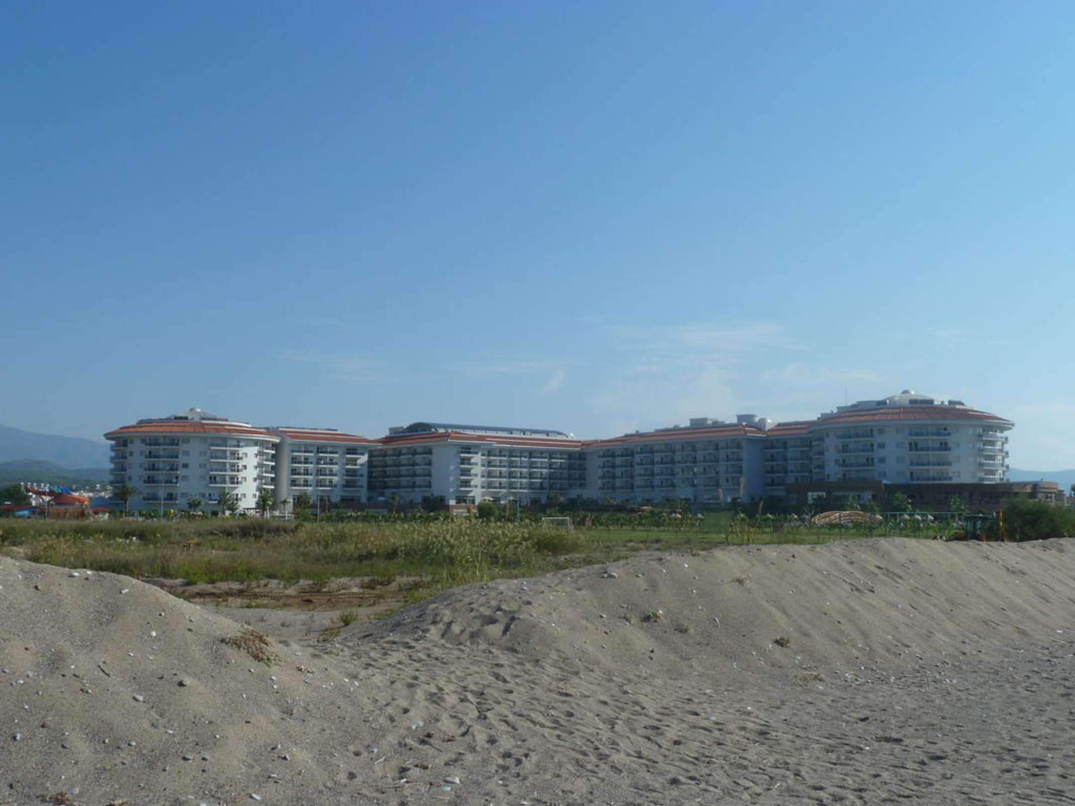 Blick vom Strand auf das Hotel.