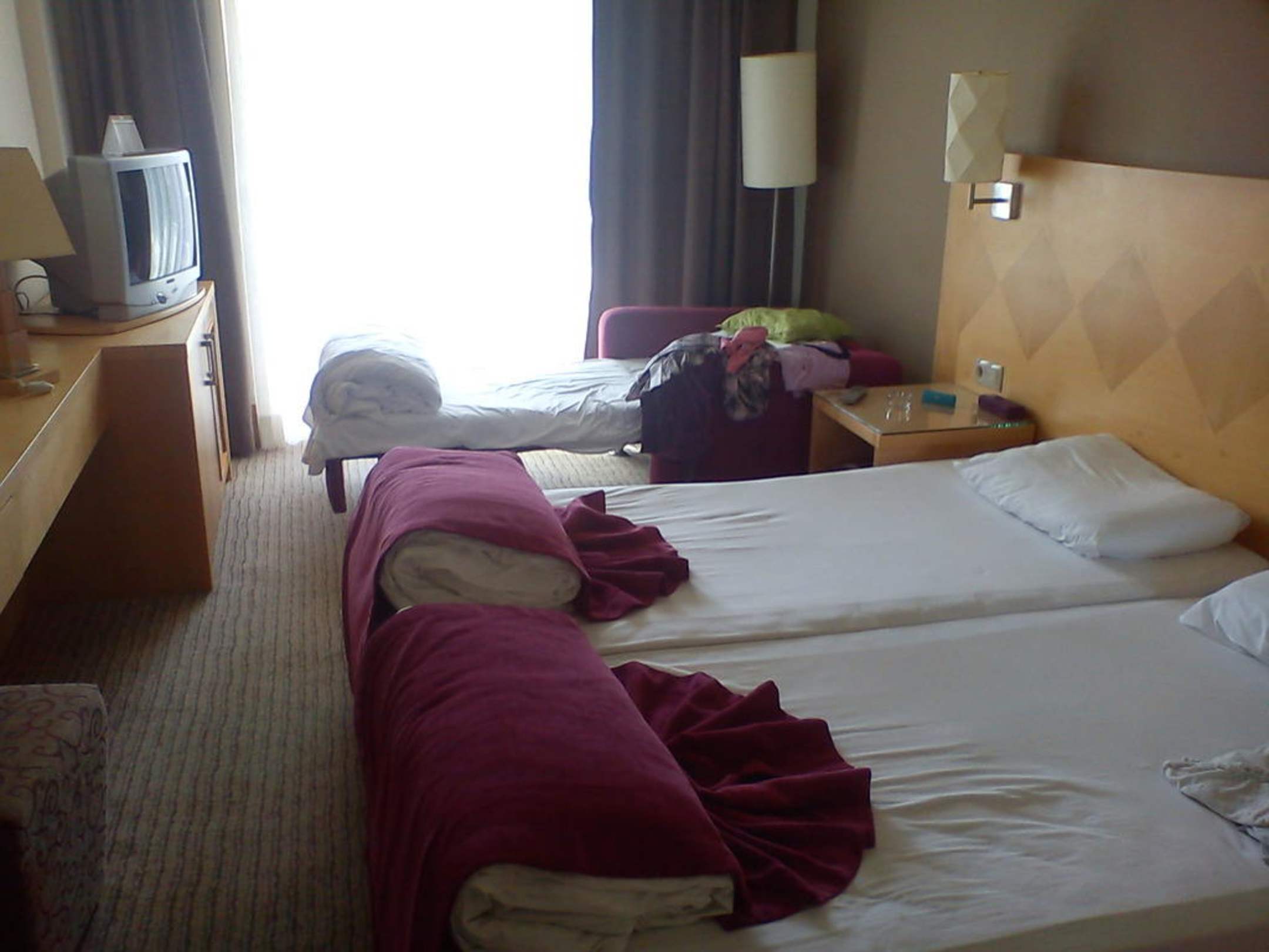 So fanden wir unser Zimmer bei der Anreise vor. Hinten am Fenster ist das Zustellbett, welches ein Sessel mit Schlaffunktion ist.