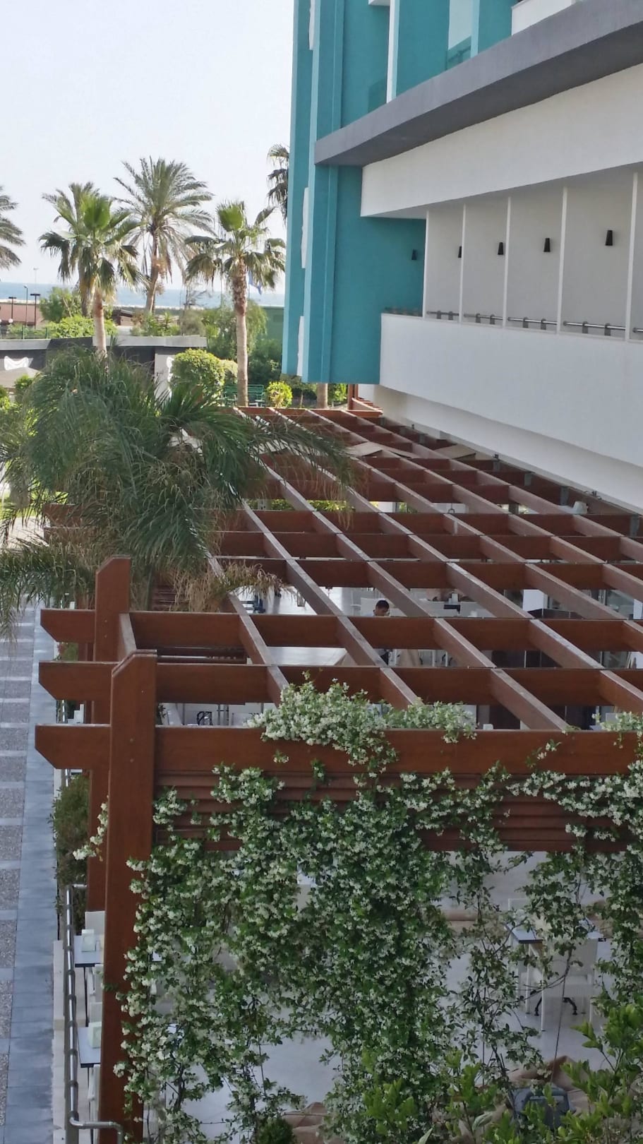 Auf dem Foto sieht man (kurz vor den Palmen im Hintergrund), dass endlich schon mal 2 Sonnenschutztücher angebracht wurden.