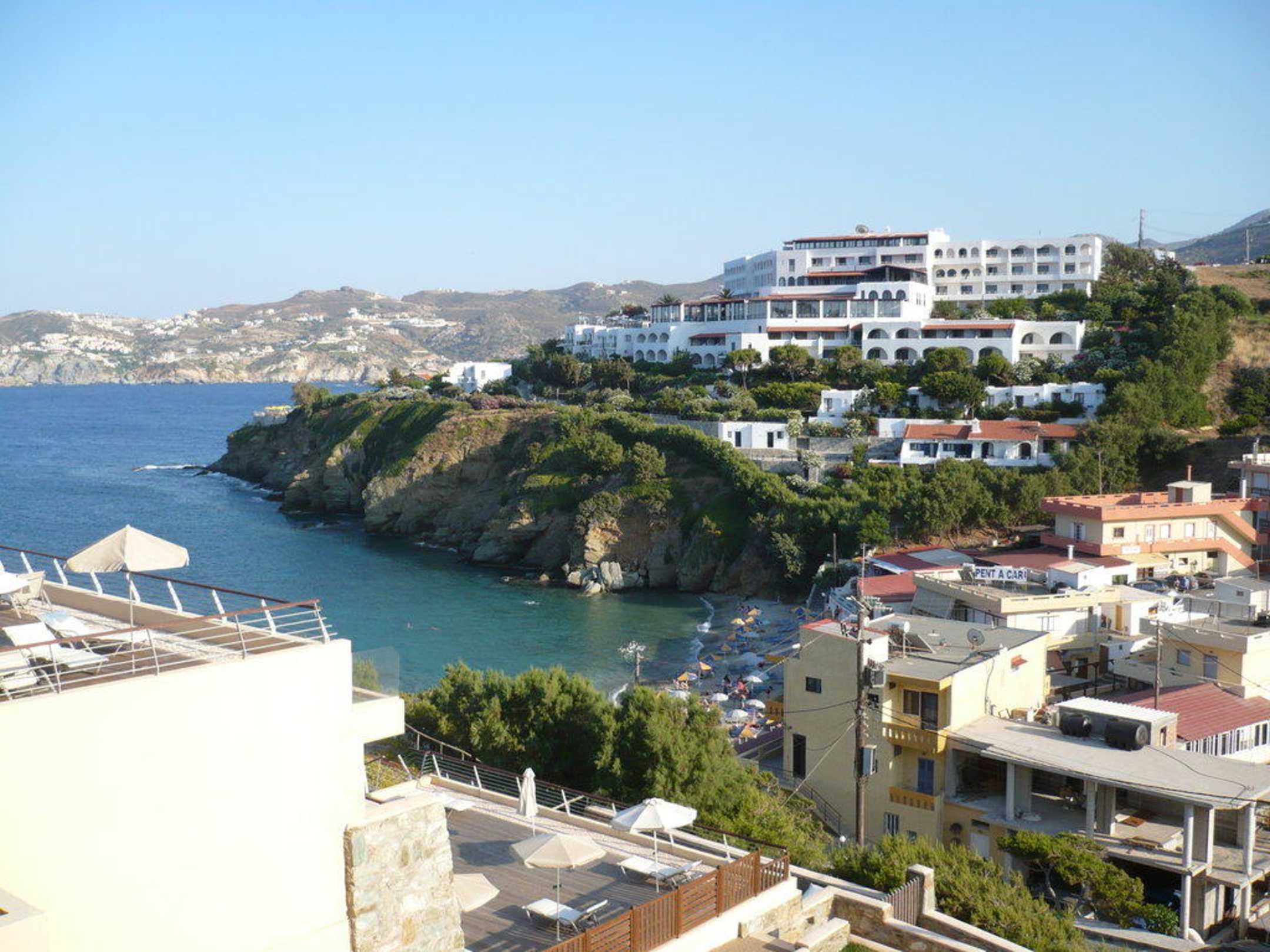 Aussicht aus dem HotelzimmerMan sieht den Strand,eine kleine Einkaufsmöglichkeit mit Tavernen und das gegenüberliegende Hotel.