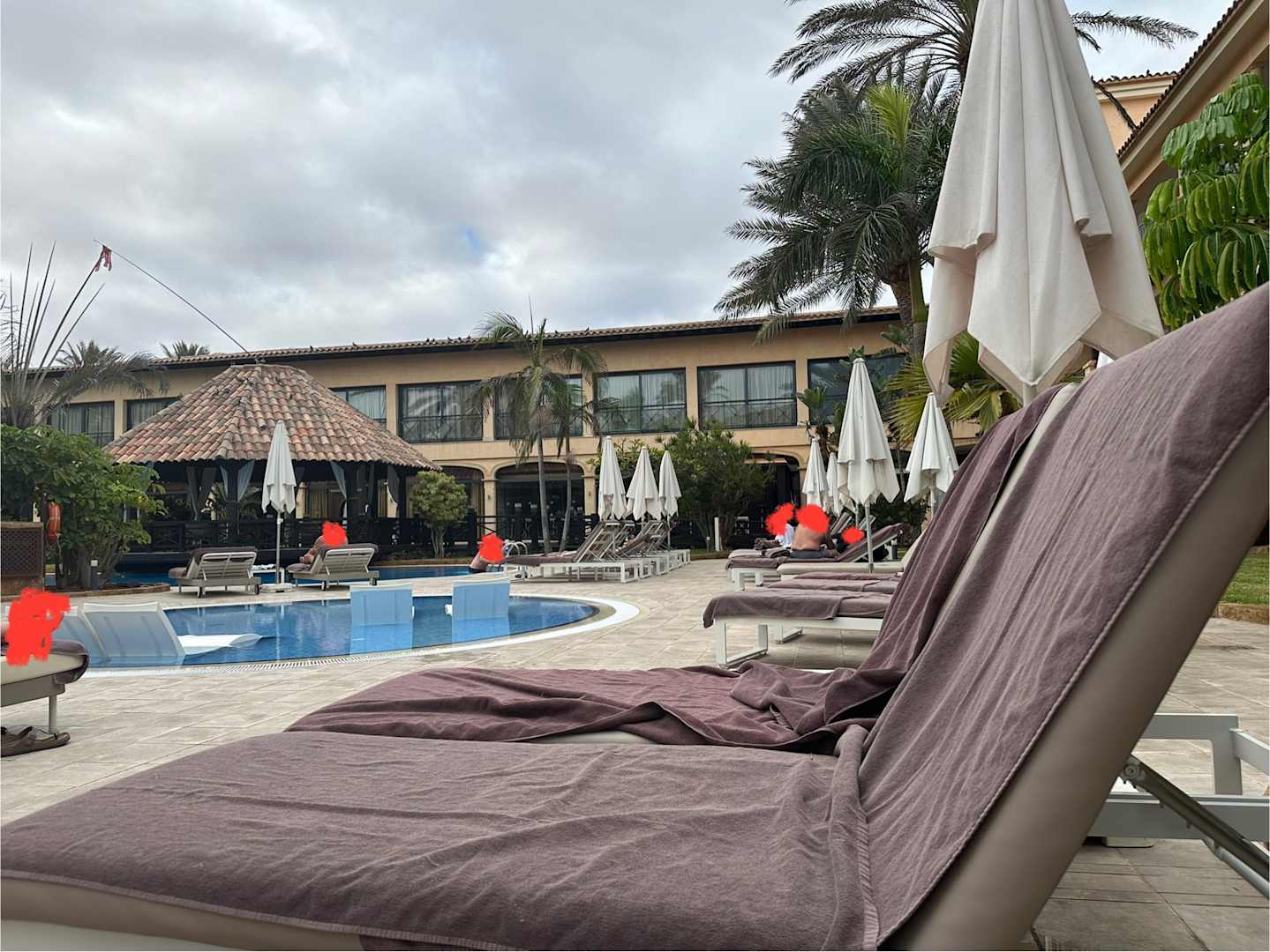 Kleiner (sehr kalter) Pool mit integrierten Liegen. Man sieht hier auch das Problem, dass ab 9 Uhr sobald der Pool öffnet, die Leute wie verrückt Liegen für den Tag reservieren, die dann aber frühestens ab 11 Uhr in Anspruch genommen werden