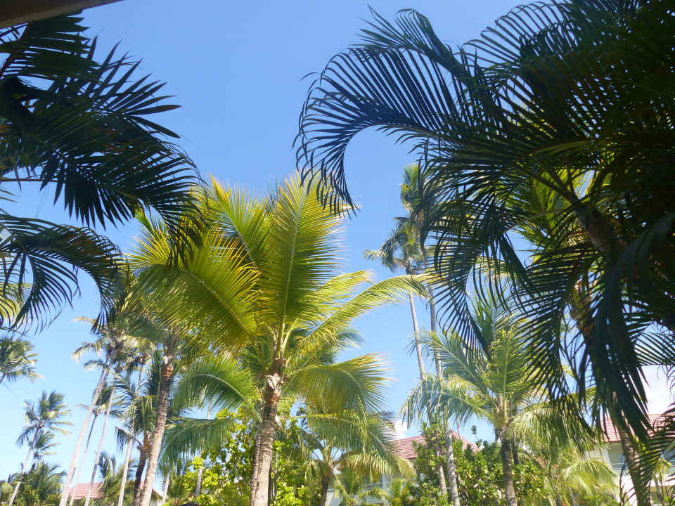 Blick durch die Palmenanlage in den blauen Himmel