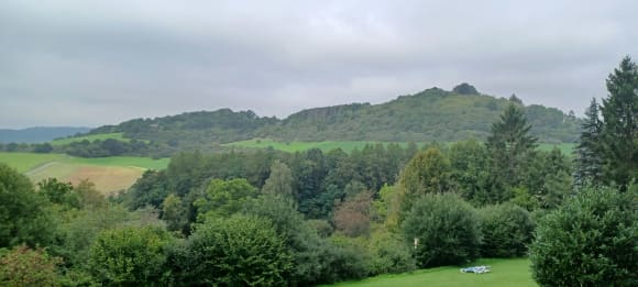 Ausblick vom Balkon in den Garten und die Landschaft