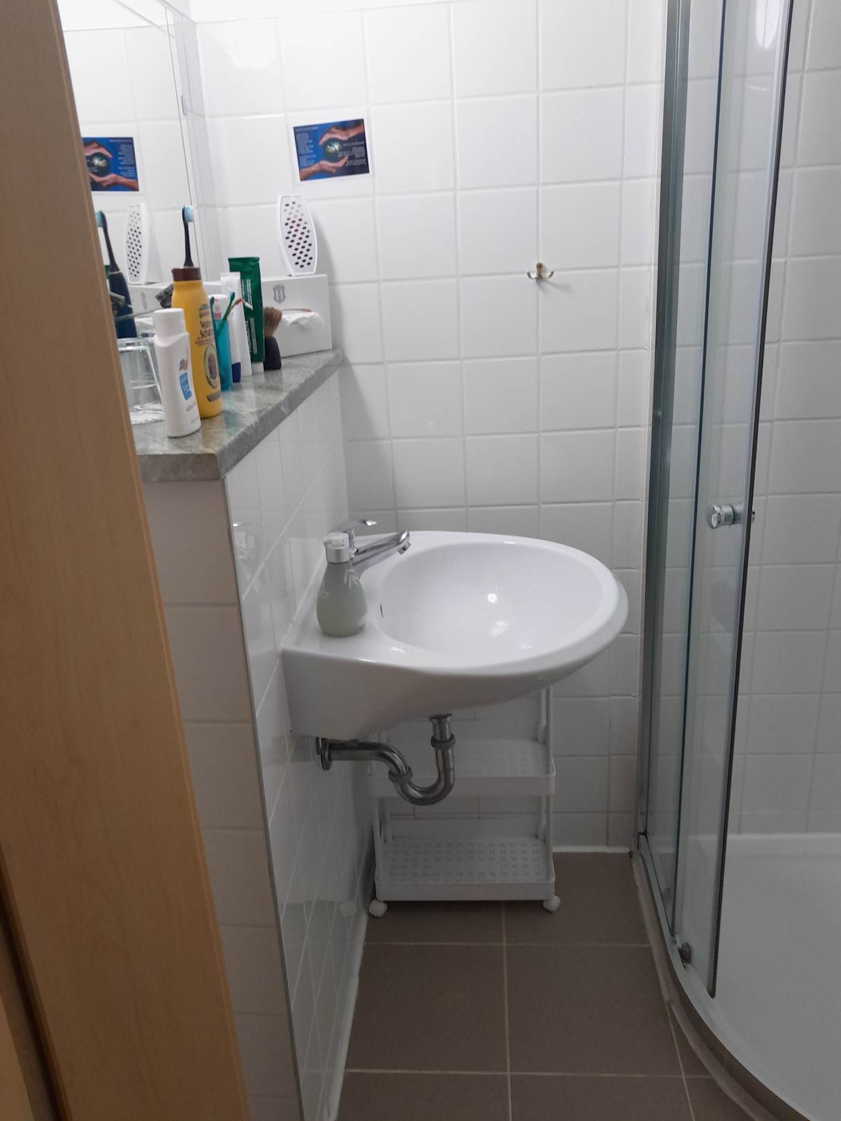 Enge im Bad zwischen Waschbecken und Duschkabine. Man konnte nur links vom Waschbecken sich waschen.