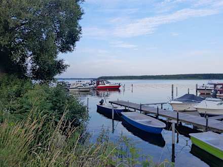 Schweriner See im Hintergrund eine Insel mit Bootssteg und Booten.