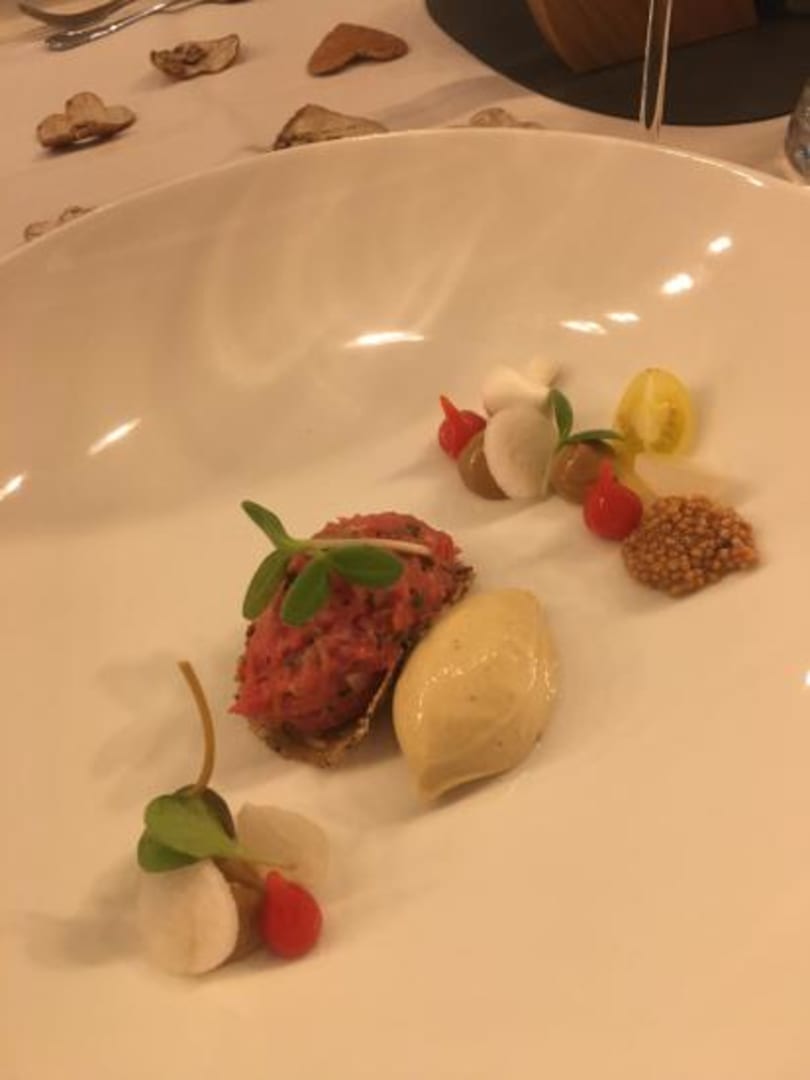Beef Tartar vom Almochsen mit Senfeis und schwarzen Knoblauch