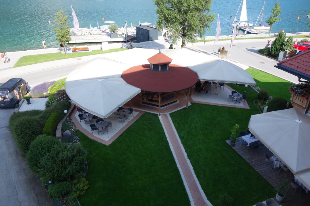 Blick vom Balkon auf die Sonnenterrasse des dazugehörigen See-Restaurants