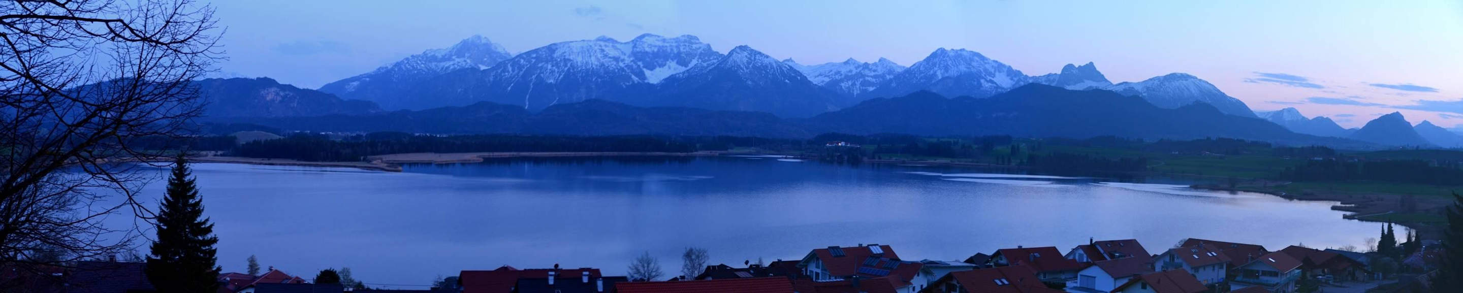 Der Hopfensee in der Dämmerung von der Burgruine aus aufgenommen. Das Seehotel Hartung ist hier nicht erkennbar, liegt aber links von der großen Tanne links im Bild direkt am See.