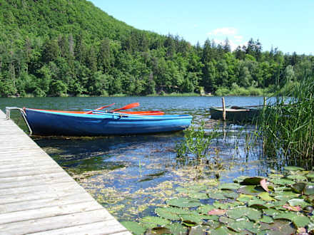 Blick vom Badesteg des Hotels auf den See