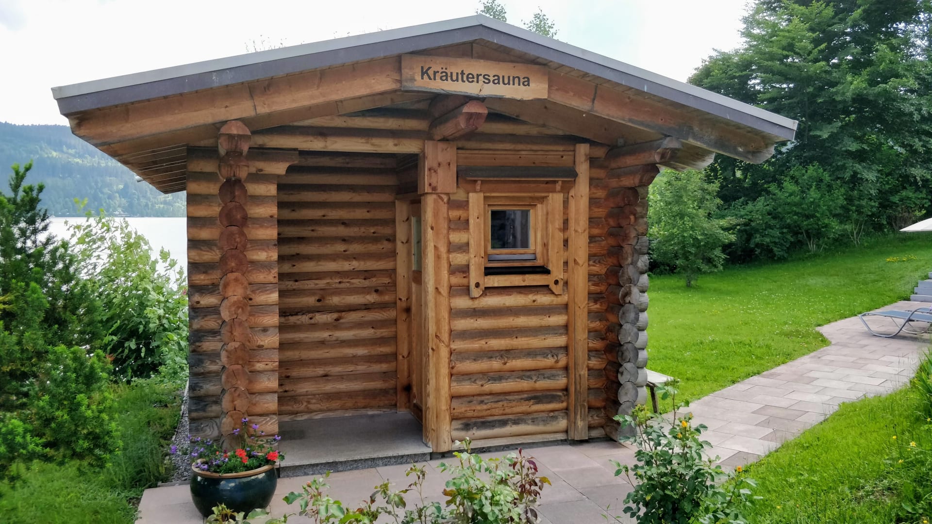 Kräutersauna im Garten, daneben Ruhebereich