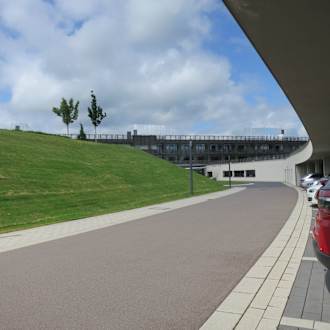 Die Hotelzufahrt Richtung Rezeption, rechts die Carport-Plätze (gebührenpflichig)