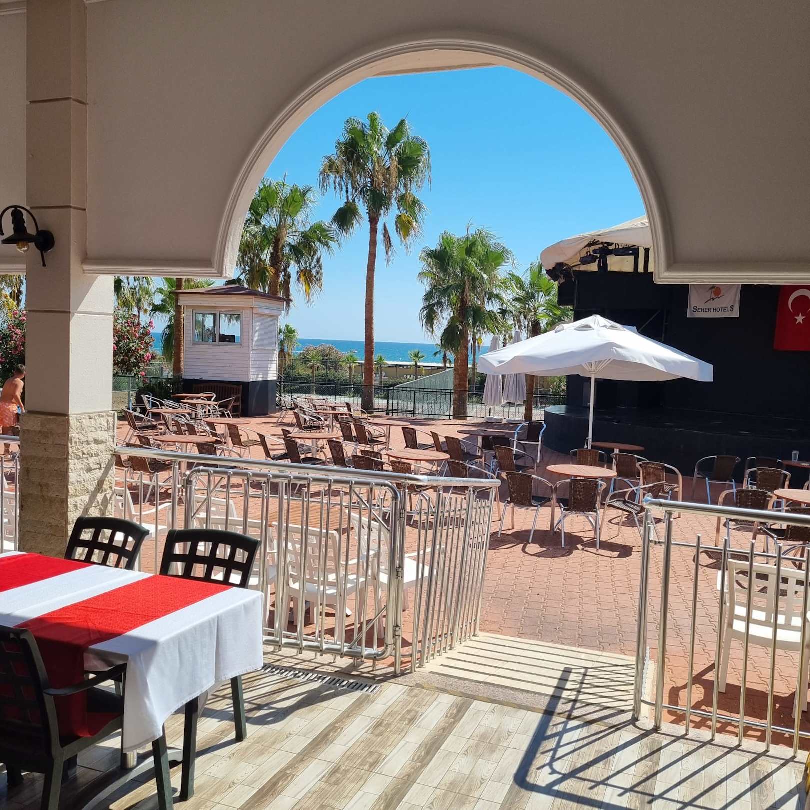 Poolbar mit Blick zur Bühne und dahinter das Meer