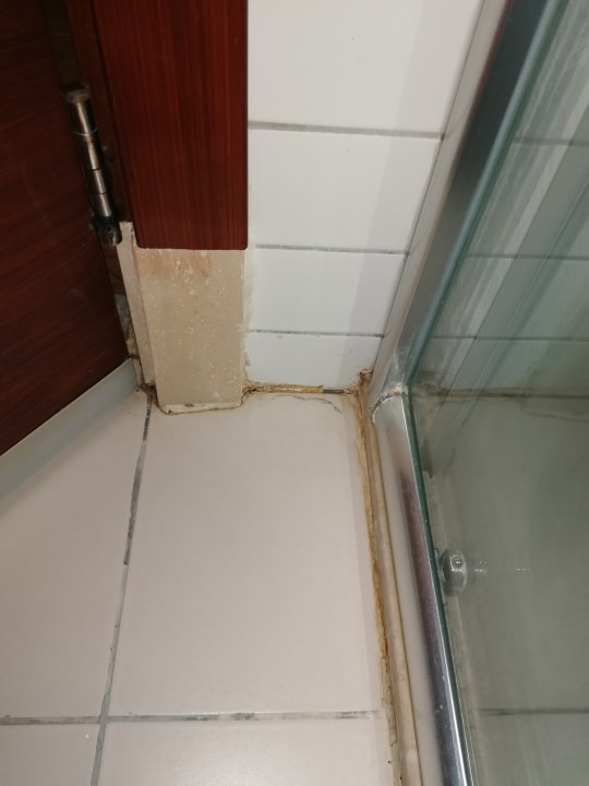 ZimmerBad undicht. Wasser läuft nach der Benutzung aus dem Badezimmer in den Flur unter den Bodenbelag