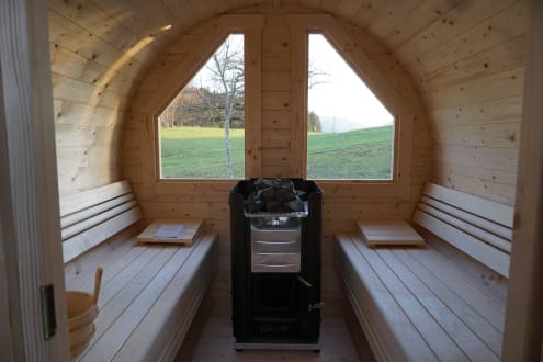 Unsere neue Fass-Sauna mit Holzofen und Bergblick
