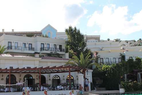 Hotelblick vom Strandunten ist das Italienische Restaurant zu sehen, darüber die einzelnen Etagen des Hotels.
