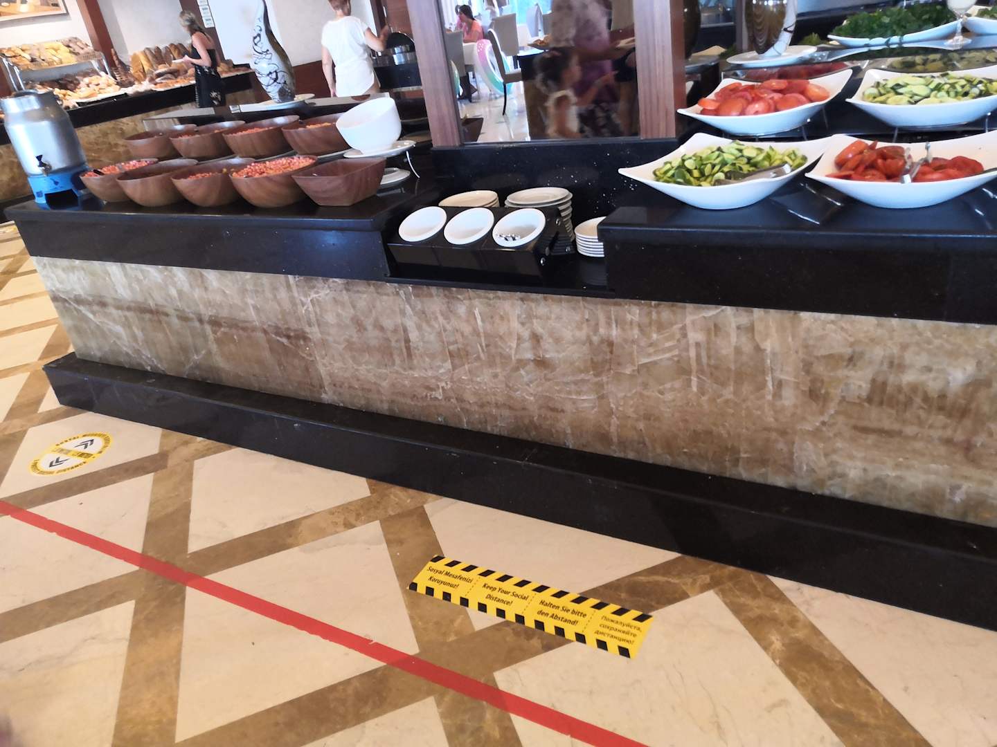 Auch im Speisesaal fand man etwas merkwürdige Begrenzungen. Die sind jedoch nicht mehr aktuell und durch ein Seil auf der roten Linie ergänzt worden.