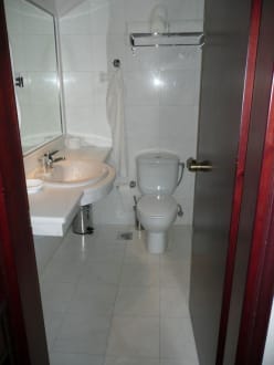 Unser Badezimmer. Sehr sauber und ordentlich. Hinter der Tür befindet sich eine Badewanne mit Duschvorrichtung. Neben dem Spiegel gibt es einen eingebauten Föhn, sehr praktisch.