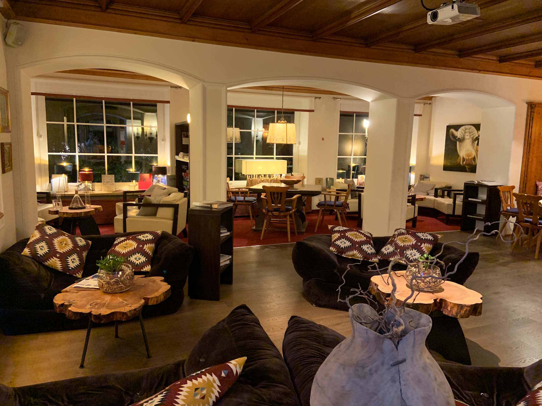Hotellobby mit Bücher, Kamin und Spielen
