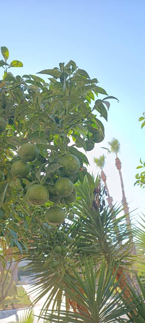 Orangen wachsen auf der Einfahrt zum Hotel.