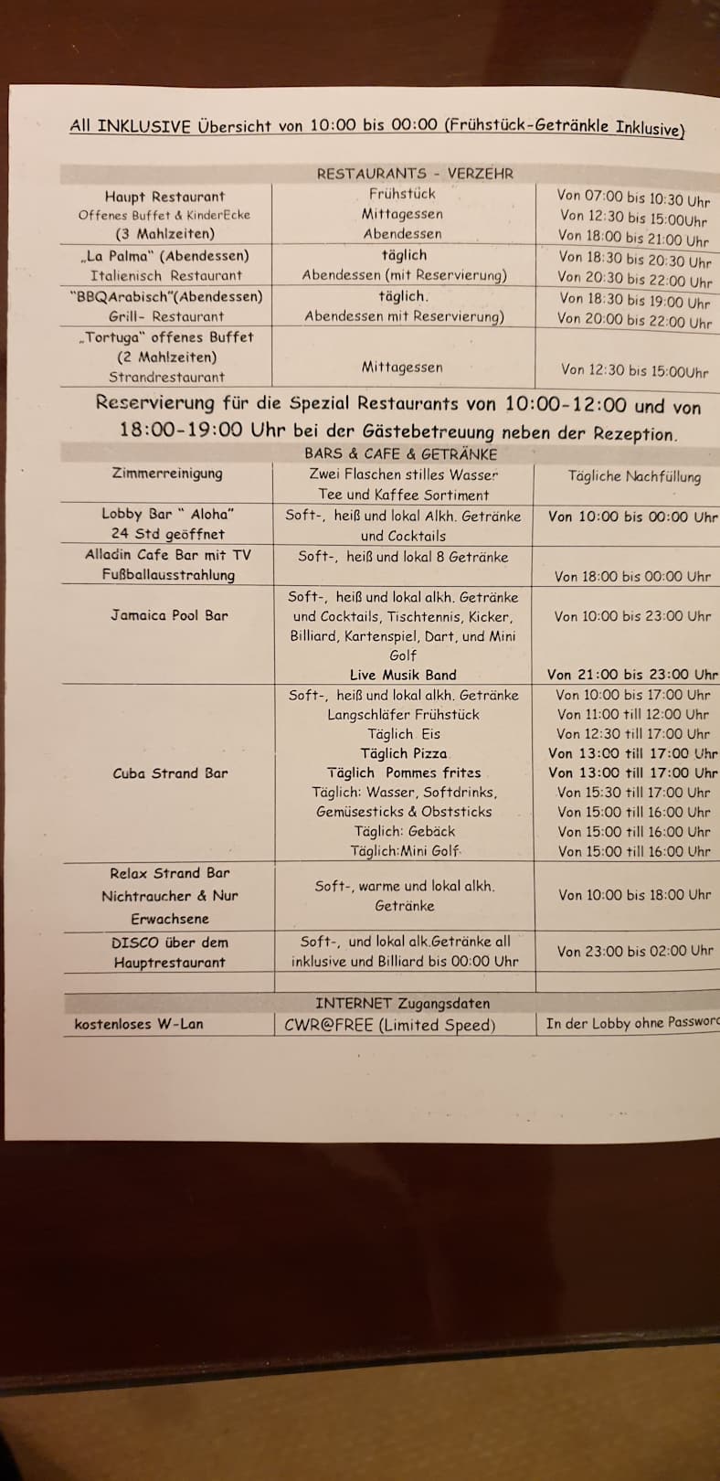 Öffnungszeiten der einzelnen Bars und Restaurants