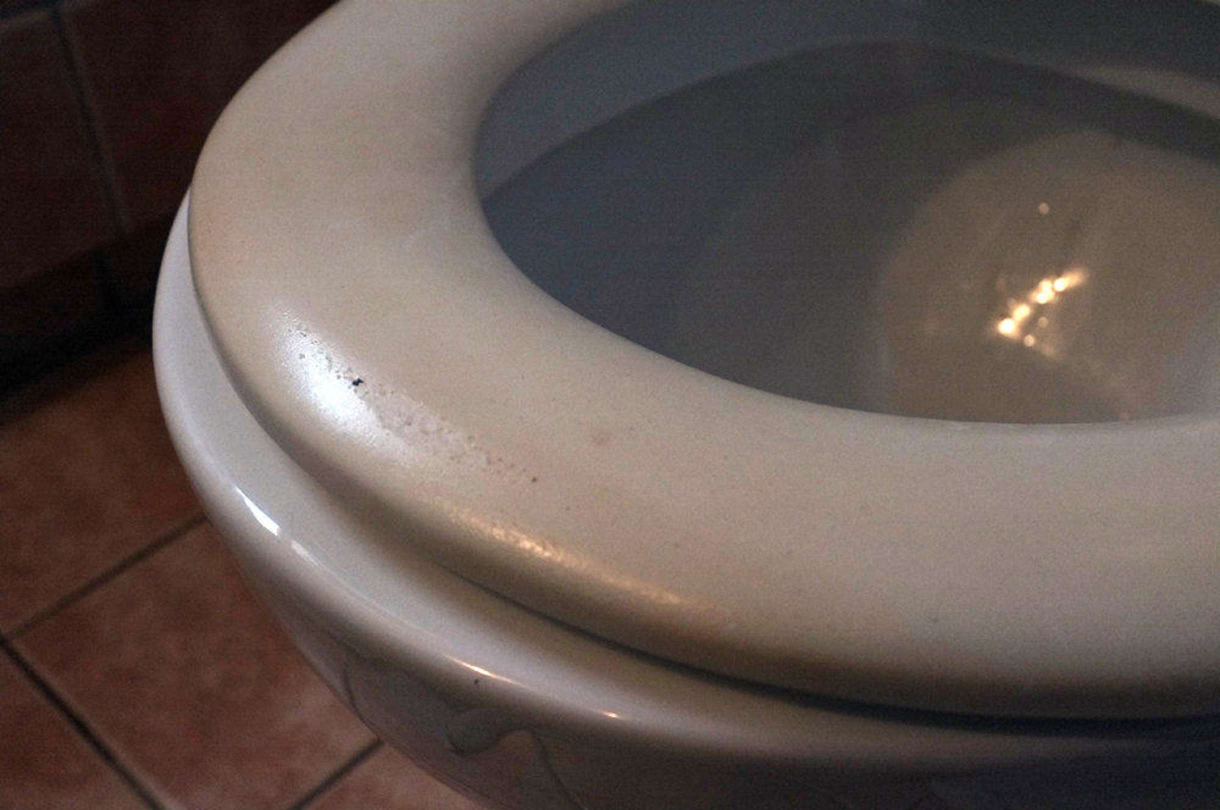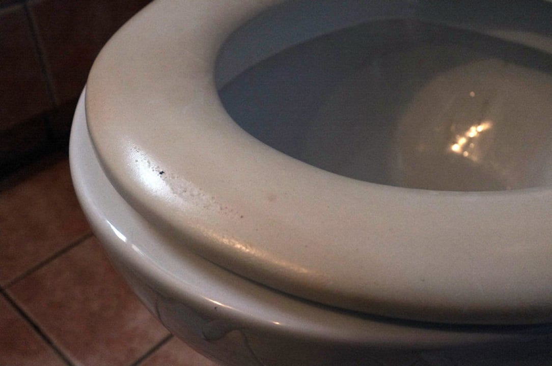 Abgenutzte und verfärbte Toilettenbrille.