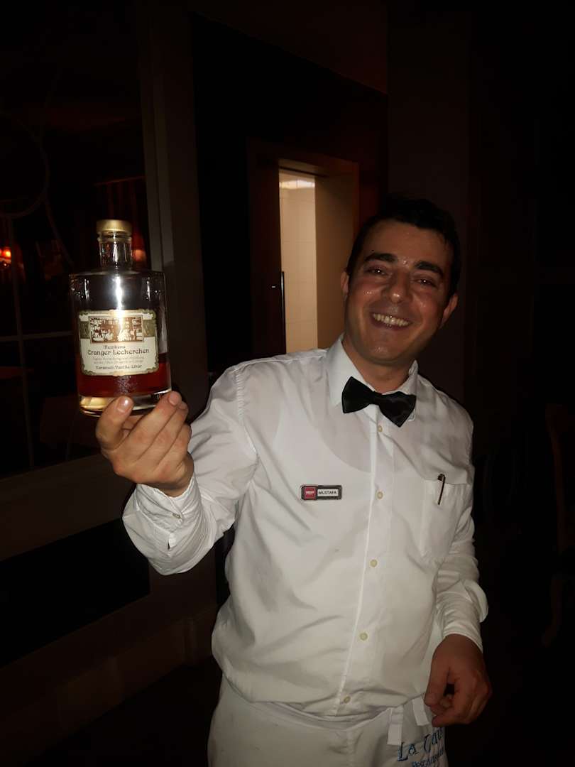 Kellner Mustafa kredenzt uns eine mitgebrachte Spezialität aus der Heimat