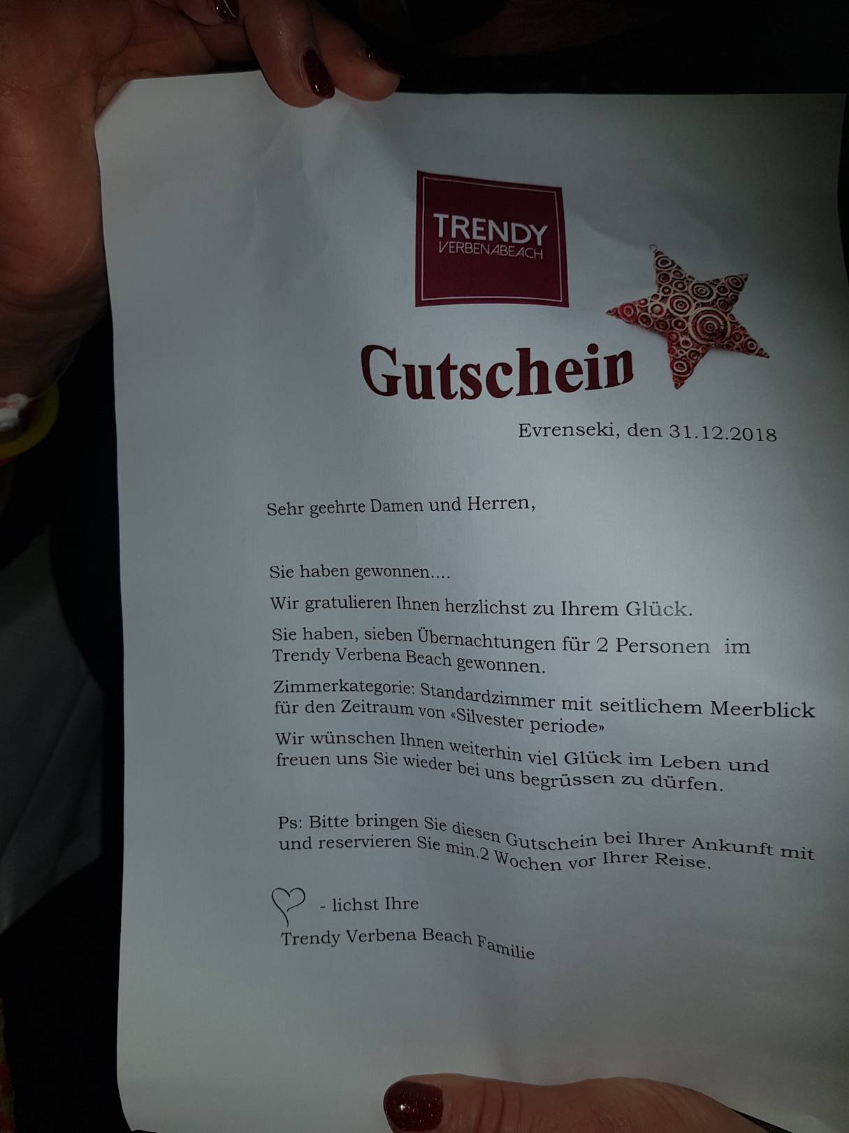 1. Preis hat die Freundin bei der Silvestertombola gewonnen