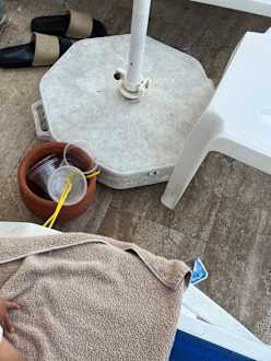 Morgens früh am Pool. Noch immer voll Müll vom Vortag