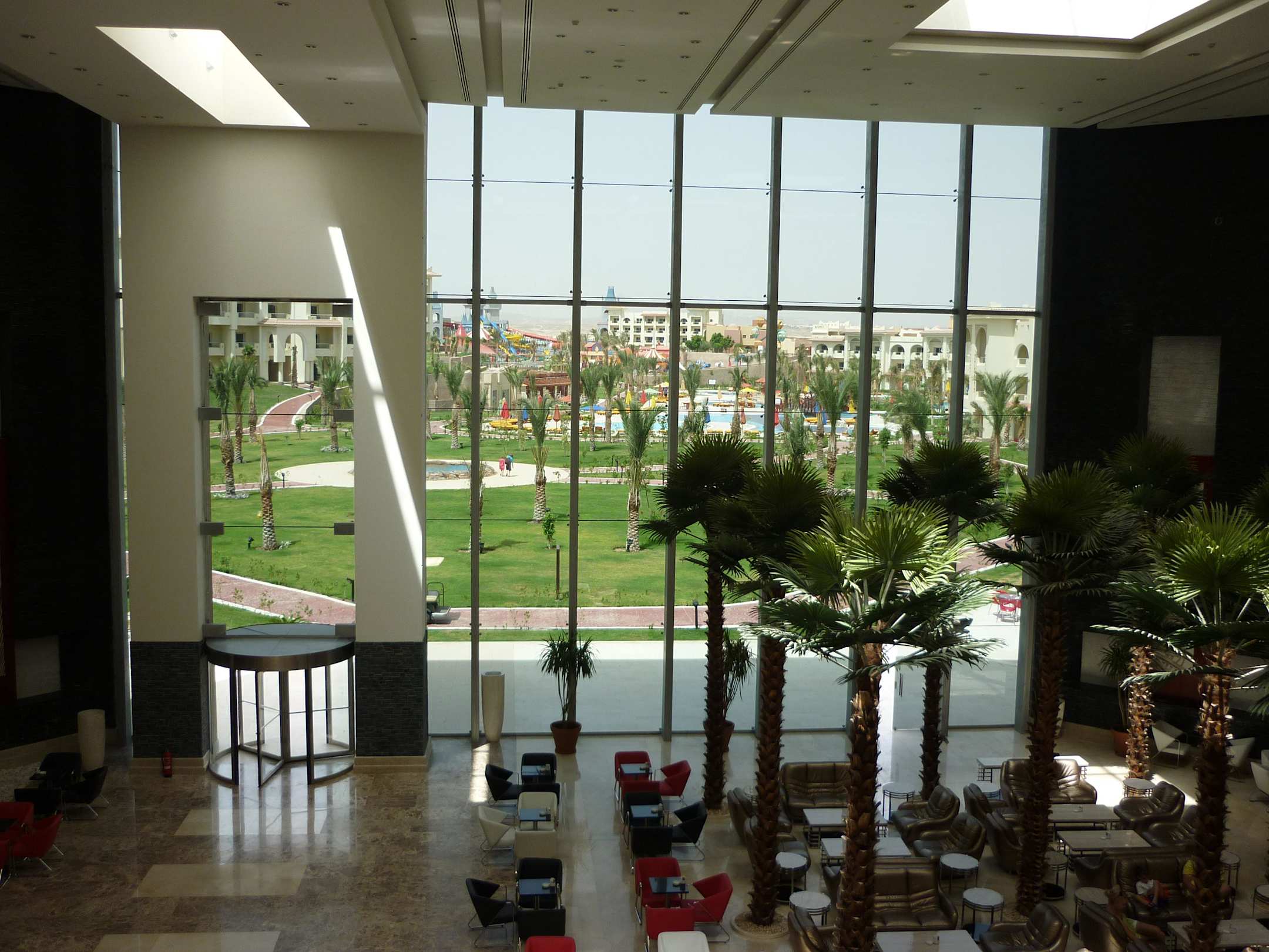 Blick von der Rezeption auf die Lobby &die Anlage