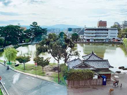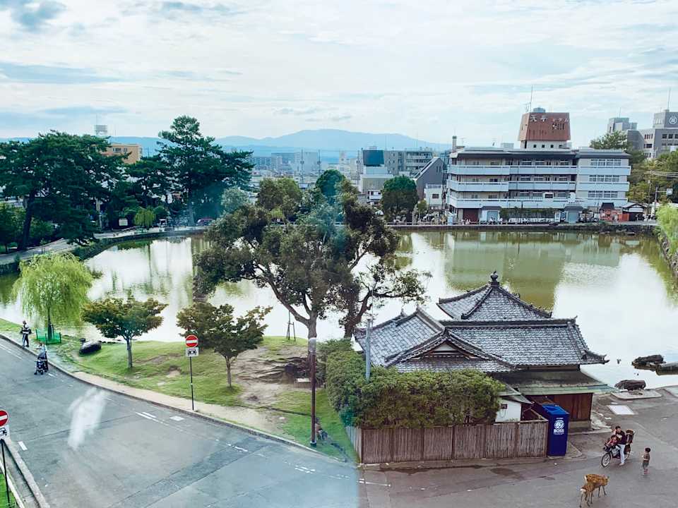 Blick auf den zentralen See in Nara. Zwei der typischen Hirsche unten rechts.