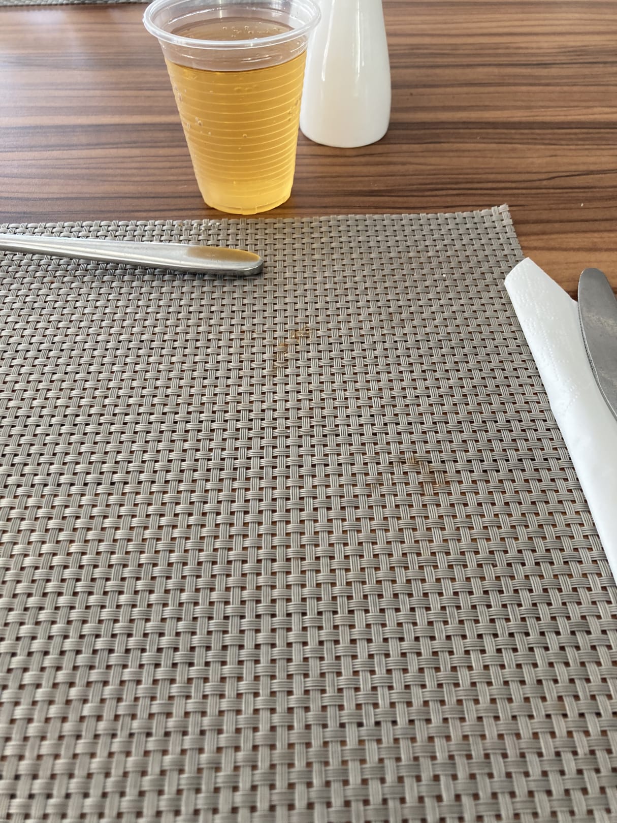 GastroPlatzdeckchen oft dreckig + Plastikbecher + wackliger Tisch.