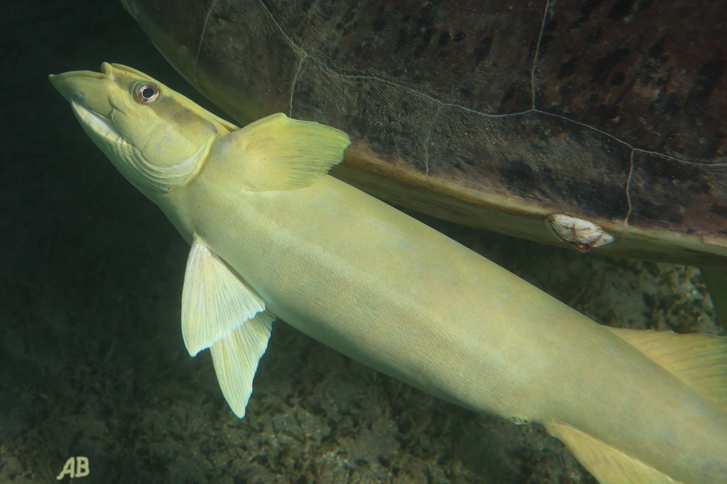 viele Schildkröten mit Schiffshaltern in der Bucht